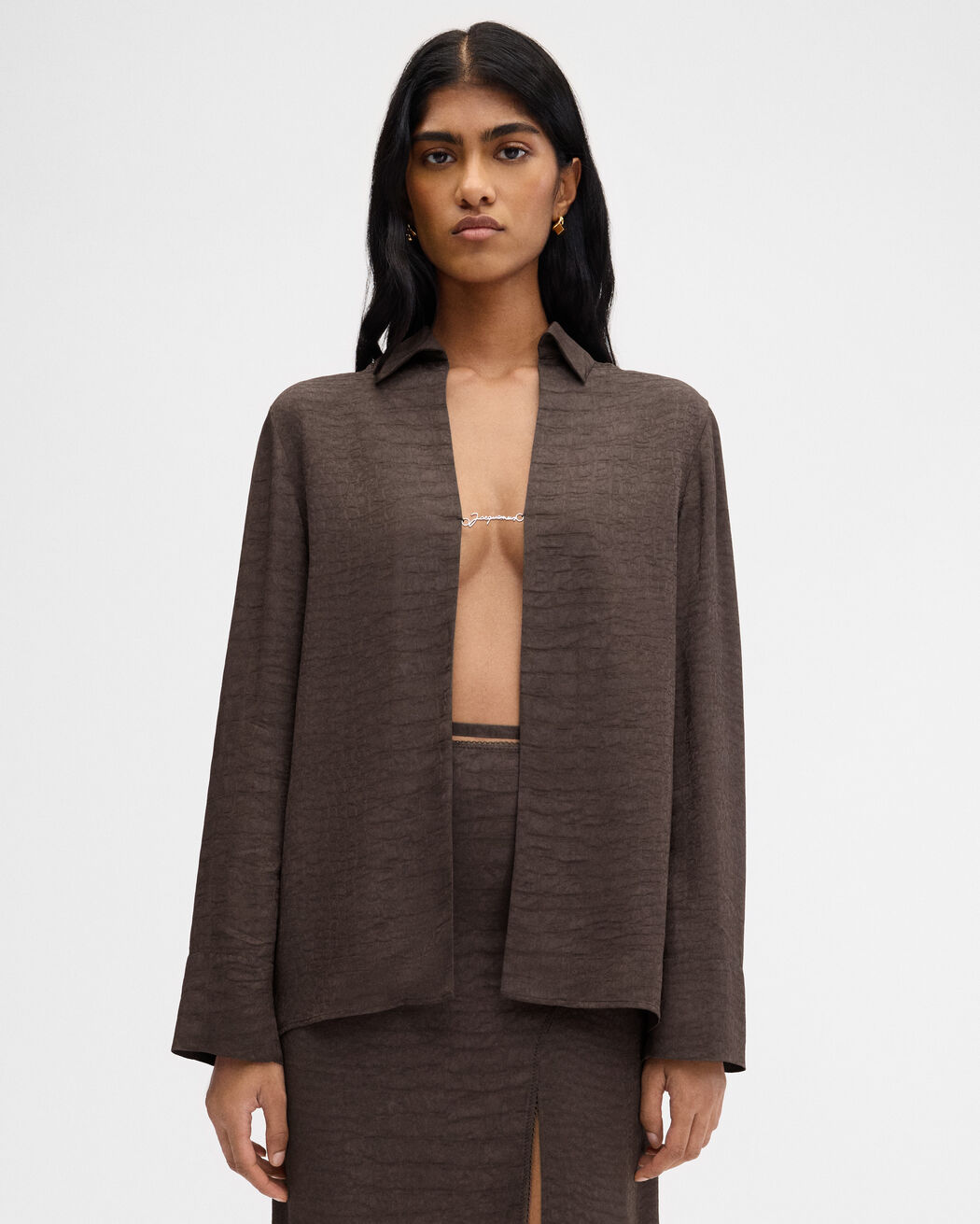 قميص بتصميم مفتوح مزين بحلية معدنية بشعار الماركة.