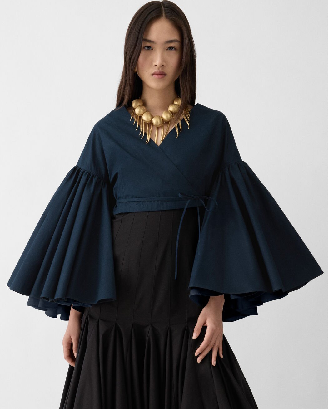 - Long flared sleeves with godets
