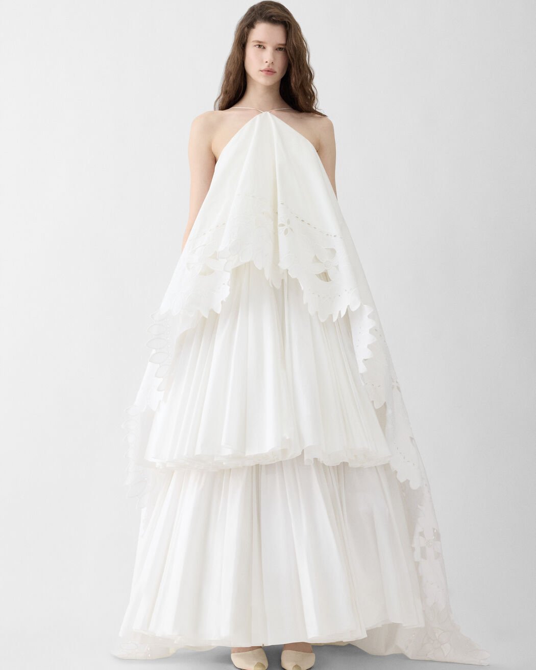 - Layered silhouette with a floral embroidered top layer